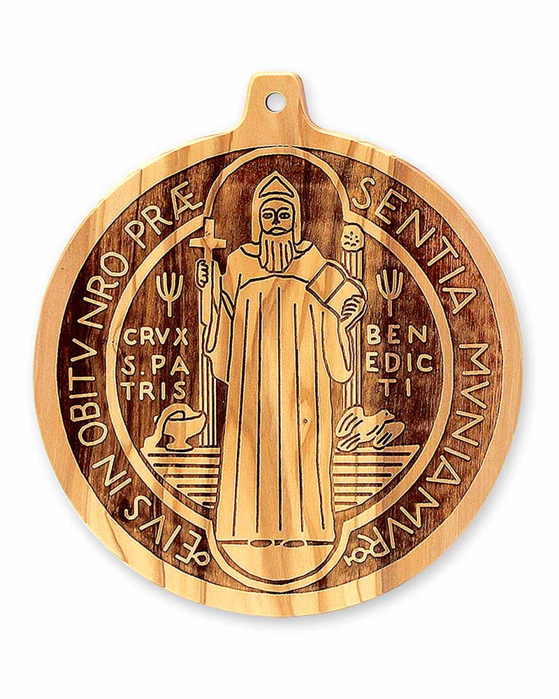 Die Benediktusmedaille geht auf den heiligen Benedikt von Nursia zurück und ist seit Jahrhunderten ein fester Bestandteil christlicher Tradition. Die lateinischen Inschriften stehen für Segensformeln und werden mit Schutz und geistlicher Orientierung verbunden. Olivenholz hat im biblischen Kontext eine lange Bedeutung und gilt als Zeichen für Frieden und Beständigkeit. In dieser Ausführung verbindet die Wandplakette traditionelle Symbolik mit handwerklicher Fertigung und wird häufig in Kirchen, Klöstern und privaten Gebetsräumen verwendet.