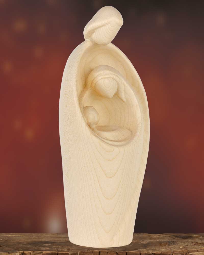 Diese Darstellung der Heiligen Familie ist aus naturbelassenem Ahornholz gefertigt. Die Figurengruppe misst 20 cm in der Höhe und 8 cm in der Breite. Das schlichte Design mit sanften Konturen zeigt Maria, Josef und das Kind in enger, schützender Haltung. Die Oberfläche ist unbehandelt, wodurch die natürliche Maserung des Ahornholzes sichtbar bleibt. Diese Holzschnitzerei eignet sich zur Aufstellung in Gebetsräumen, als Teil einer Hauskrippe oder als stiller Begleiter im Alltag. Aufgrund ihrer Größe ist sie auch für kleinere Altäre oder Sideboards gut geeignet.