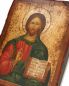 Die Ikone von Jesus Christus, in der Darstellung als Pantokrator, wurde nach einem byzantinischen Vorbild mit Farben aus Eitempera gemalt und mit Blattgold belegt, 14 x 18 cm. Altes Holz und Krakeleerisse geben der Ikone einen antiken Charme.
