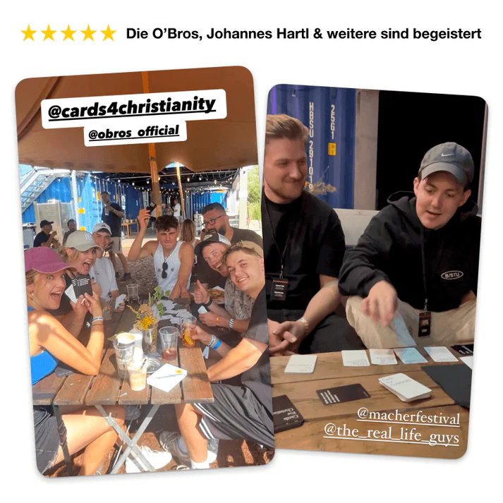 Cards for Christianity ist ein Kartenspiel mit biblischen Originalzitaten für Spielabende, Hauskreise und Familienrunden. Das Spiel umfasst 50 Fragenkarten und 200 Antwortkarten in deutscher Sprache. Ziel ist es, passende und zugleich überraschende Kombinationen zu bilden, die Gesprächsanlässe rund um Bibeltexte schaffen. Geeignet für Kleingruppen, Gemeindearbeit oder den privaten Gebrauch. Der Lieferumfang beinhaltet das vollständige Kartenset sowie eine Anleitung in einer stabilen, hochwertigen Aufbewahrungsbox. Cards for Christianity verbindet Bibelwissen, Gemeinschaft und Spielspaß in strukturierter Form und eignet sich als Geschenkidee für christliche Familien und Gemeindemitglieder.