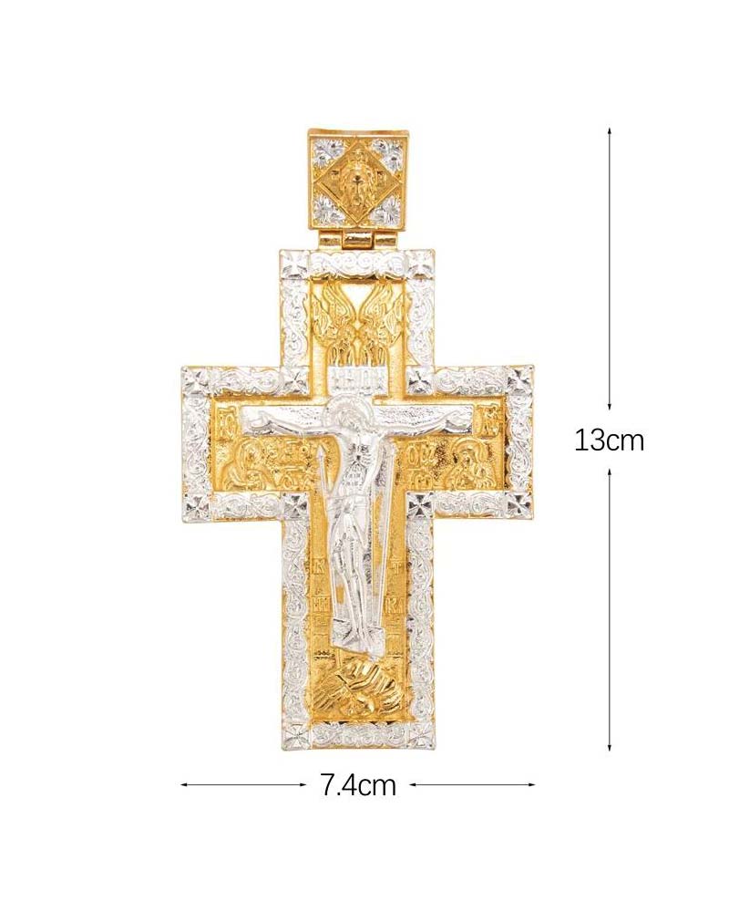 Dieses Bischofskreuz, auch Pektorale genannt, ist vergoldet und zierversilbert gefertigt und misst 7,5 x 13 cm. Auf der Vorderseite befindet sich ein Kreuzigungsrelief in Silber mit ziervergoldeten Elementen, auf der Rückseite ein graviertes Kreuzigungsrelief. Das Kreuz besteht aus solidem Messing, ist gegossen, versilbert und oxydiert verarbeitet. Die 120 cm lange, verstellbare Kette mit Karabinerverschluss ermöglicht eine flexible Anpassung und eignet sich auch für den Dienst des Hl. Nikolaus. Das Bischofskreuz wird in einem Geschenk- und Aufbewahrungsetui geliefert. Als liturgische Insignie erinnert das Pektorale an die Kreuzigung Jesu Christi und gehört zur bischöflichen Amtskleidung.