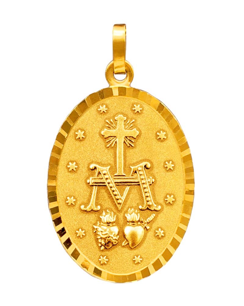 Wundertätige Medaille facettiert aus 8 ct Gold, Maße 12 x 14 mm. Der fein gearbeitete Anhänger zeigt die klassische Darstellung der Wundertätigen Medaille mit umlaufender Inschrift und strukturierter Rückseite. Die facettierte Oberfläche sorgt für klare Lichtreflexe und eine präzise Kontur. Gefertigt aus 8 ct Gold, mit stabiler Öse für gängige Kettenstärken.