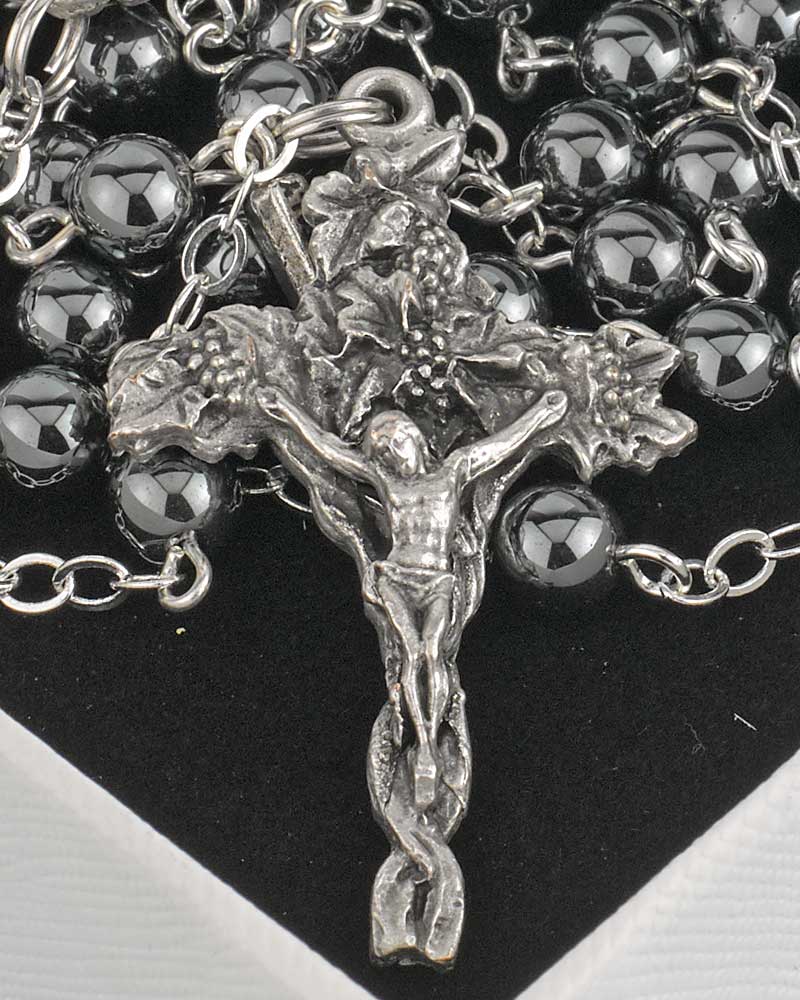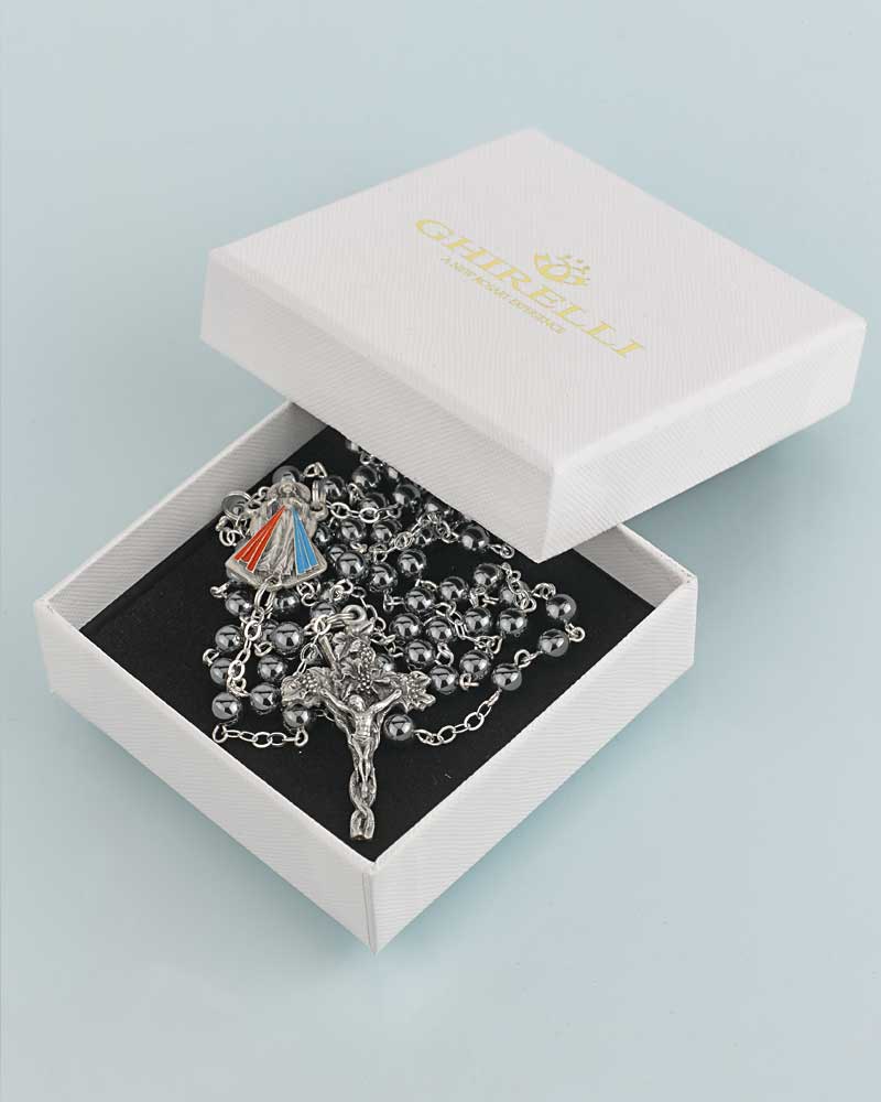 Dieser Rosenkranz „Ampelos“ besteht aus schwarzen Hämatit-Perlen mit einem Durchmesser von ca. 6 mm. Die Kettenglieder sind silberfarben und sorgen für Stabilität sowie ein schlichtes, klares Design. Mit einer Gesamtlänge von ca. 58 cm eignet sich der Rosenkranz sowohl zum Beten als auch zum Tragen. Das Mittelstück zeigt ein stilisiertes Kreuzsymbol, das an die Verbundenheit mit Christus erinnert. Hämatit ist ein robustes Mineral mit metallischem Glanz, das in christlichem Schmuck für seine schlichte Eleganz geschätzt wird. Original aus dem Hause Ghirelli, eignet sich der Rosenkranz „Ampelos“ auch als dezentes christliches Geschenk.