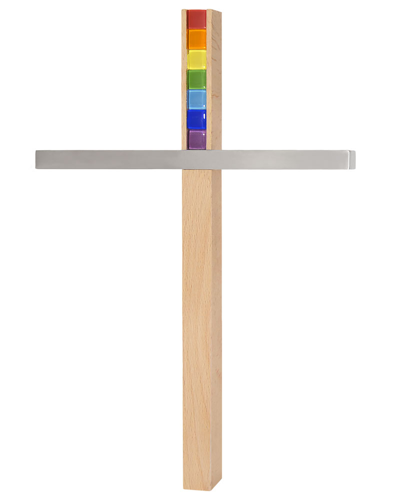 Dieses Holzkreuz aus Buche (25 x 16,5 x 1,7 cm) kombiniert natürliche Materialien mit modernen Elementen. Der senkrechte Holzbalken trägt ein Inlay aus bunten Glassteinen in Regenbogenoptik, das in Handarbeit eingesetzt ist. Der Querbalken aus Edelstahl ergänzt die klare Form und sorgt für Stabilität. Auf der Rückseite befindet sich eine Lochbohrung zur sicheren Wandaufhängung. Das Kreuz eignet sich für Kirchenräume, Gemeinderäume oder den privaten Andachtsbereich. Die Verbindung aus Holz, Edelstahl und Glas verleiht dem Wandkreuz eine ausgewogene Materialwirkung und unterstützt eine ruhige, zeitgemäße Gestaltung.