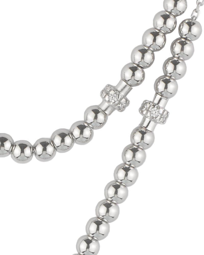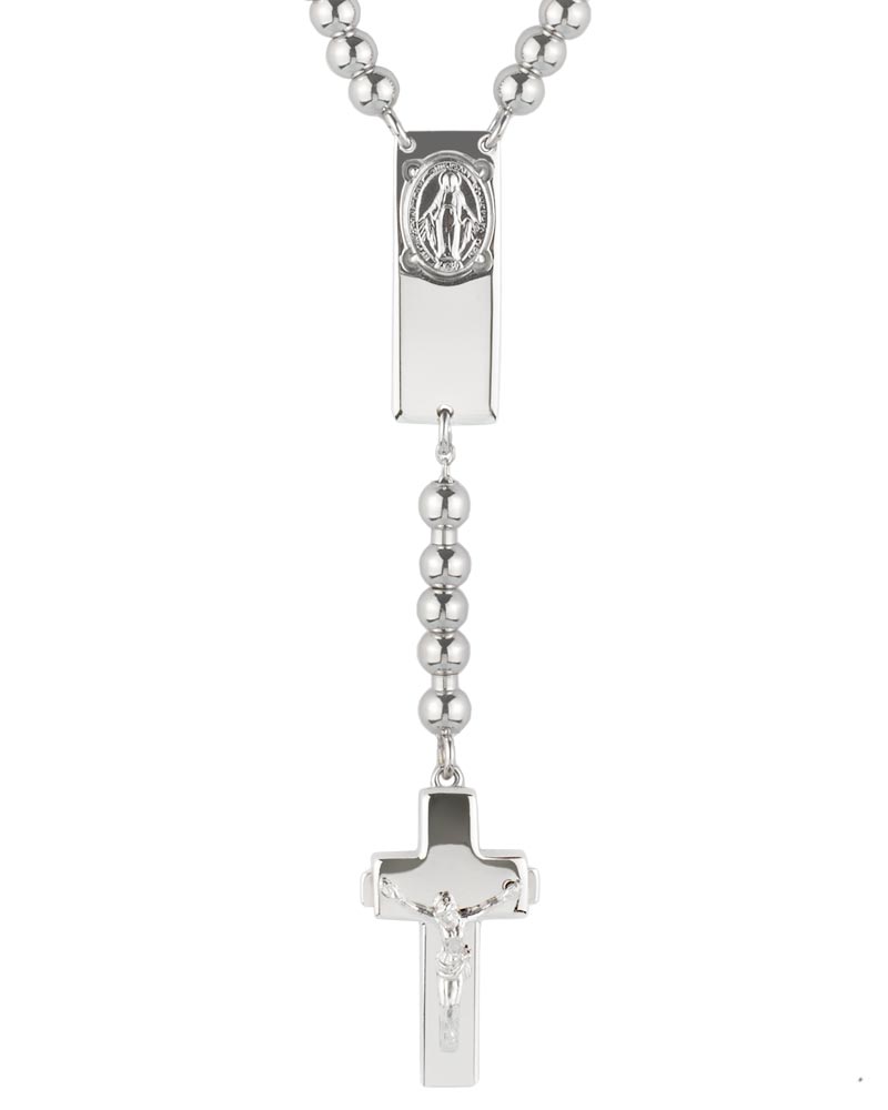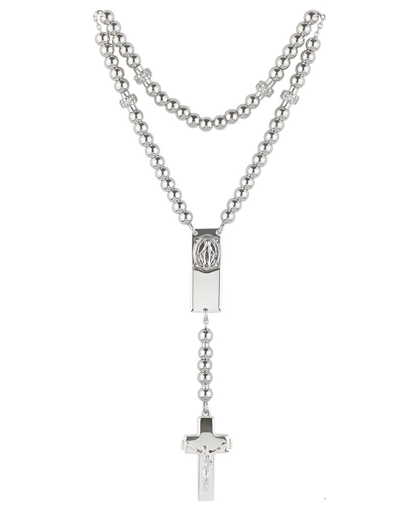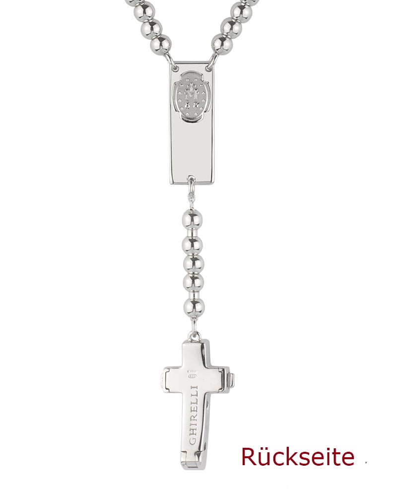 Das Rosalet Traditional in Silber von Ghirelli ist ein Rosenkranz-Armband aus rhodiniertem 925er Sterlingsilber in Größe S (16,5–17,8 cm). Die Ave-Maria-Perlen (4 mm) und Pater-Noster-Perlen (6 mm) sind präzise gearbeitet, letztere mit Kristall-Pavé besetzt. Das Kruzifix ist einheitlich silberfarben ausgeführt und mit einem Christuskorpus versehen, zugleich dient es als patentierter Doppel-Sicherheitsverschluss zur sicheren Anpassung. Eine Wundertätige Medaille ist in das Zwischenstück integriert. Die handverschweißte Silberkette sorgt für Stabilität. Lieferung in Magnetbox mit Echtheitszertifikat und Informationsheft. Geeignet als christlicher Schmuck und vollwertiger Rosenkranz.