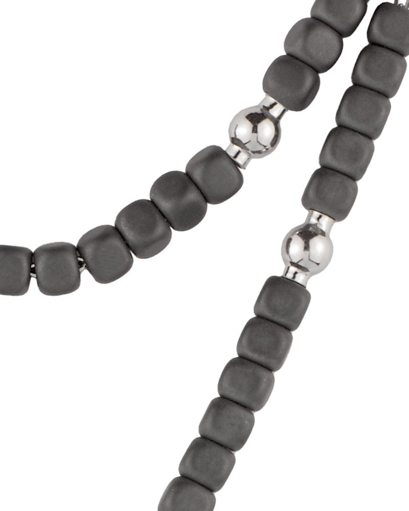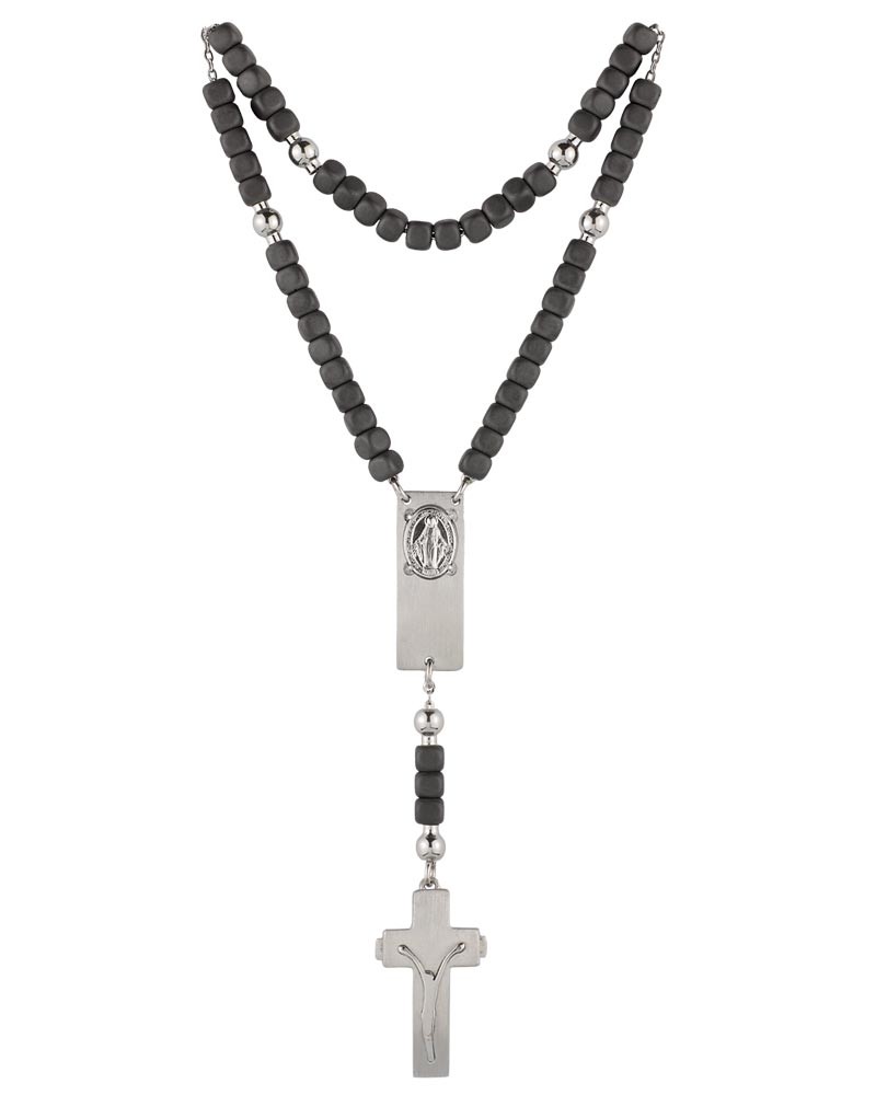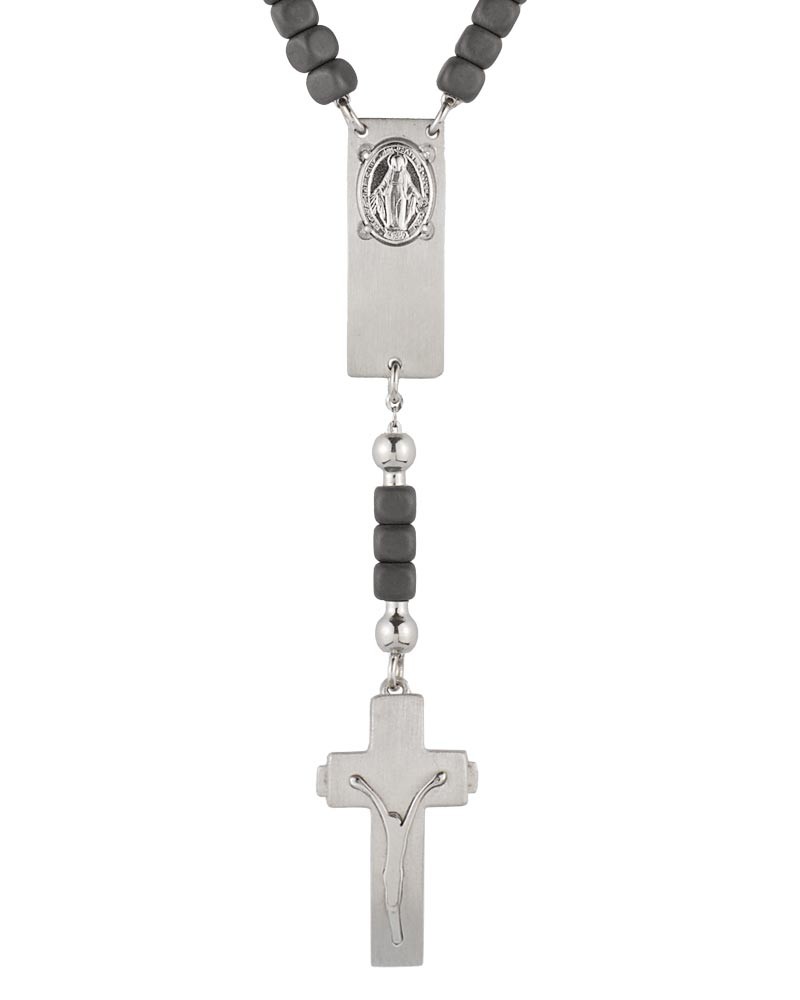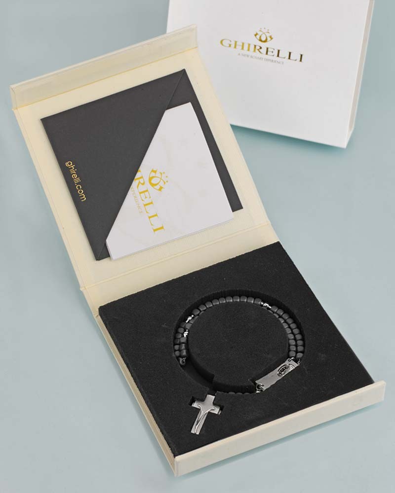 Das Rosalet® Modern von Ghirelli ist ein Rosenkranz-Armband aus mattierten Hämatitperlen und rhodiniertem 925er Sterlingsilber in Größe S (16,5–17,8 cm). Die Ave-Maria-Perlen sind als 4 × 4 mm große, viereckige Hämatitwürfel gearbeitet, ergänzt durch runde Pater-Noster-Perlen aus Silber. Das Kruzifix aus Sterlingsilber dient zugleich als patentierter Doppel-Sicherheitsverschluss zur sicheren Anpassung am Handgelenk. Eine Wundertätige Medaille ist in das Zwischenstück integriert. Die handverschweißte Silberkette sorgt für Stabilität. Lieferung in Magnetbox mit Zertifikat und Informationsheft. Geeignet als christlicher Schmuck und funktionaler Rosenkranz.