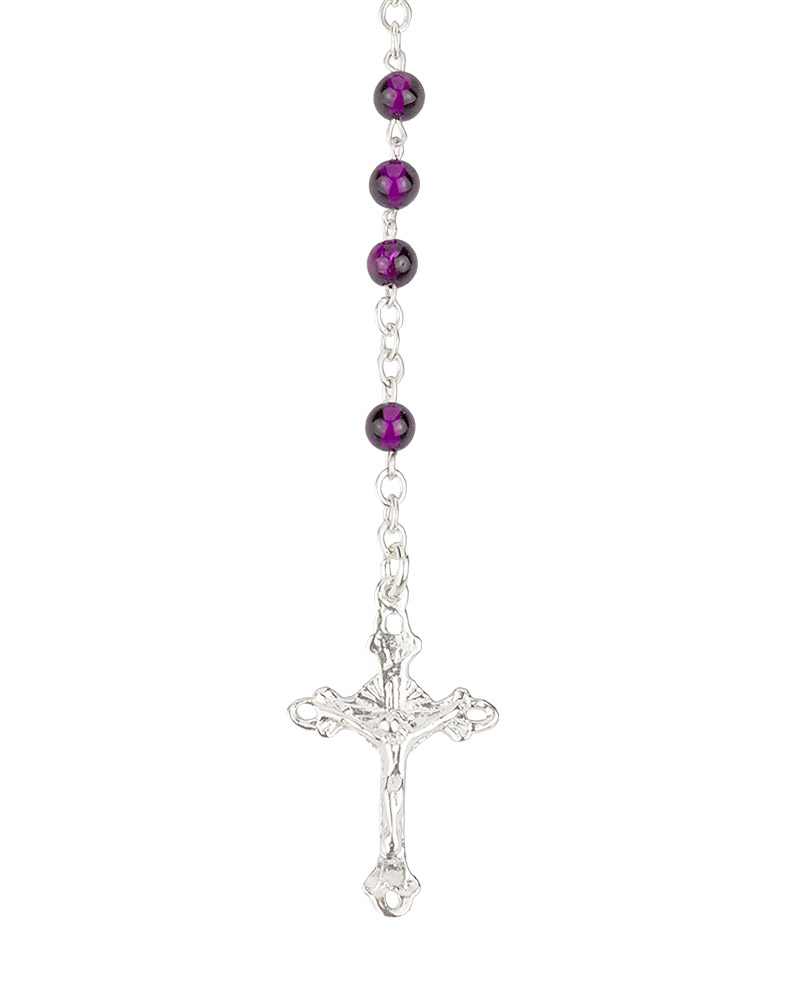 Rosenkranz mit natürlichen Amethystperlen 4 mm Ø, in kräftigem Violett, Sterling Silber gekettelt, mit Herzstück und barockem Abschlusskreuz, 33 cm lang.