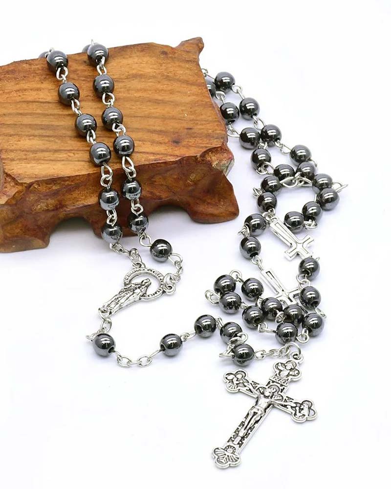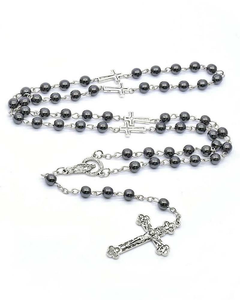 Rosenkranz mit großen, edlen Perlen, 6 mm Ø, aus echtem Hämatit, graphitfarbig schimmernd. Abschlusskreuz in barocker Form, 40 x 26 mm, mit Kleeblattenden und Christuskörper. Das Herzstück ist mit der Mariendarstellung Darstellung ist mittig durchbrochen. Alle Zwischenperlen wurden als Her Maria ausgeführt. Eine handwerklich solide Ausführung, in versilbert oxydiert.