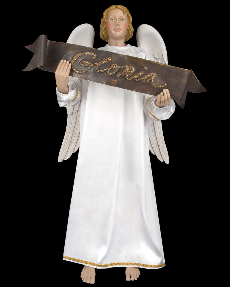 Verkündigungsengel für Ankleidekripe mit 90 cm, mit Schriftband „Gloria“ aus ziseliertem Messing, patiniert. Der Kopf, die Flügel, Hände und Füße der Hirtenfigur wurde detailreich von Hand geschnitzt und coloriert. Die passende Bekleidung der Krippenfigur ist im Preis bereits enthalten.