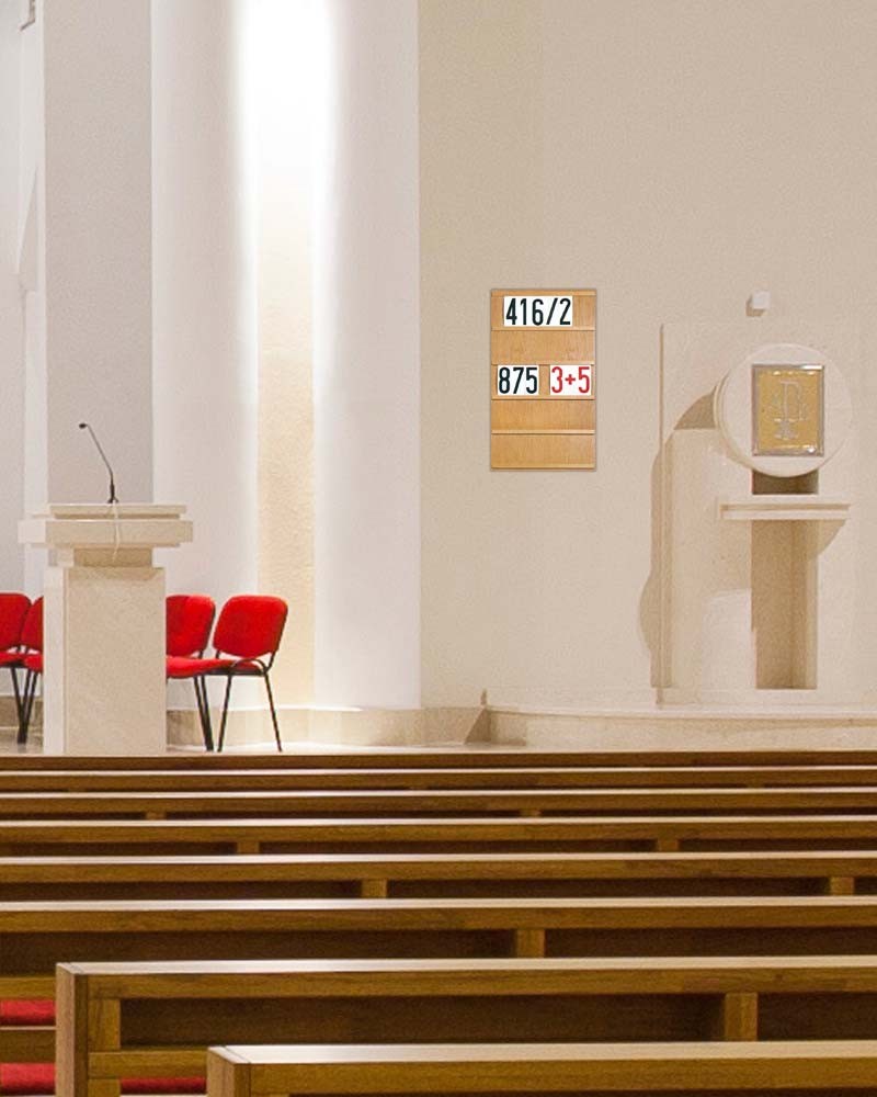Liednummern-Set aus stabilem Karton im Format 15,8 x 6,5 cm, doppelseitig bedruckt in roter Farbe. Jeder Liedanzeiger zeigt auf der Vorder- und Rückseite zwei Liednummern, die zusammen einen vollständigen Zehnersatz ergeben: 0/9 bis 4/5. Die Lieferung umfasst 10 Stück, sortiert in jeweils zwei Exemplaren je Nummernkombination. Die klare Typografie und das praktische Maß ermöglichen eine gute Lesbarkeit in Kirchenräumen. Ideal für Liedanzeigetafeln im Gottesdienst. Das Set eignet sich zur Ergänzung bestehender Liednummernserien und ist optimal für den regelmäßigen liturgischen Einsatz konzipiert.