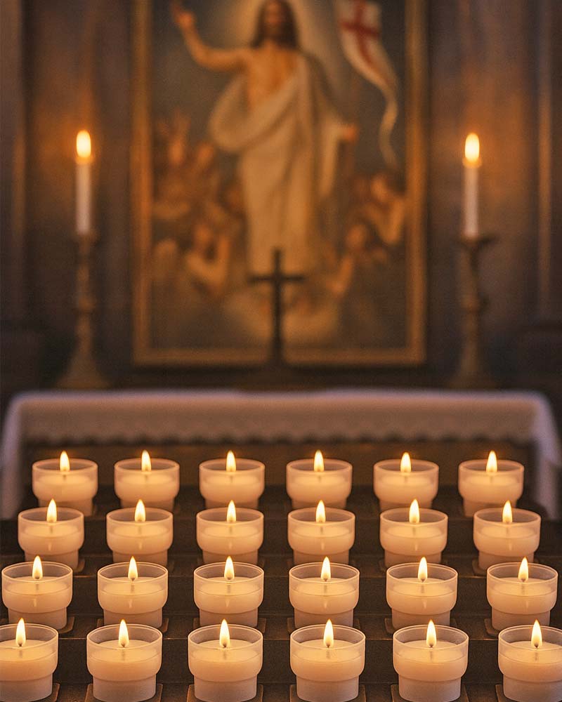 Opferkerzen aus Paraffin, mit reduzierter Füllung, 3 Stunden Brenndauer, PVC Hülle weiß, 47 mm Ø. Der Umwelt Zuliebe ! Diese Opferlichter können einfach und schnell mit Nachfüllkerzen wieder befüllt werden. Im Karton sind 300 Lichter enhalten.