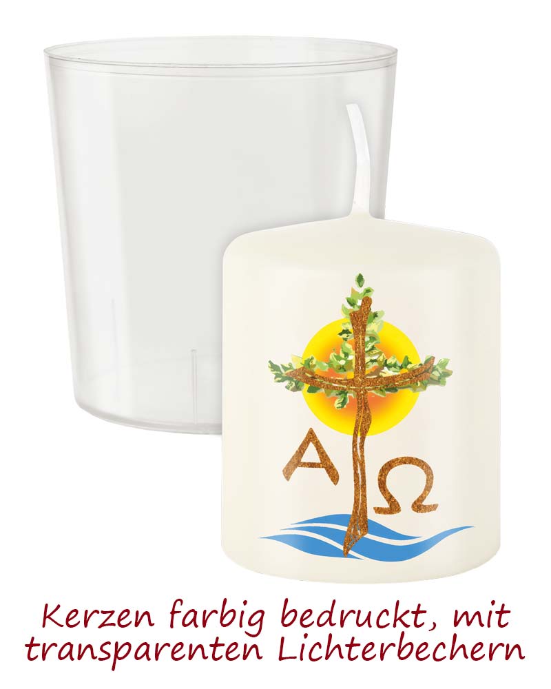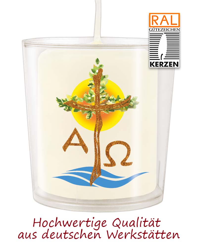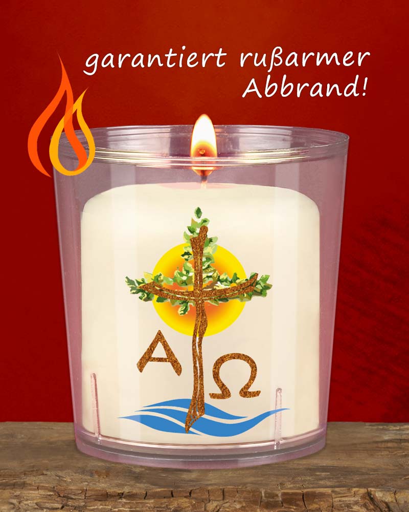 Der Lichterbecher zeigt das Motiv „Kreuz, Sonne und A + O“ und enthält 96 Kerzen im Format 60 x 50 mm. Die in transparente, hitzebeständige Kunststoffbecher gegossenen Kerzen sind tropffrei und für den Einsatz in Kirchen und Kapellen geeignet. Das langlebige Paraffin sorgt für eine gleichmäßige Brenndauer von ca. 24 Stunden. Das Kreuz mit Sonnenstrahlen und den Buchstaben Alpha und Omega verweist auf Christus als Anfang und Ende sowie das Licht der Auferstehung. Die Kerzen eignen sich für Gedenkorte, Fürbittgebete oder liturgische Feiern. Keywords: Lichterbecher Kreuz Sonne A + O, Andachtskerze, Kirchenkerze.