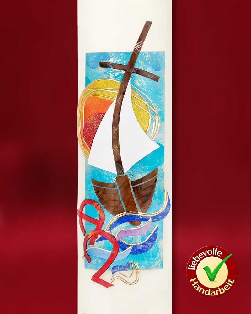 Osterkerze "Ein Schiff, dass sich Gemeinschaft nennt", A + O und Jahreszahl. Diese Osterkerze ist eine hochwertige Arbeit aus deutscher Wachszieherei, mit 10 % Bienenwachs. Detailreich und liebevoll gestaltet, in beeindruckend schöner Ausführung.