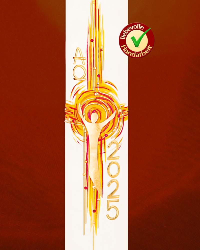 Osterkerze „Flammenkreuz“, harmonische Farbgebung, gold bis rot, Auferstehungschristus gold appliziert, mit Jahreszahl. Die beiliegenden Kreuznägel, lassen sich einfach in die vorgebohrten Löcher einstecken. Diese Osterkerze ist eine hochwertige Arbeit aus deutscher Wachszieherei, mit 10 % Bienenwachs. Detailreich und liebevoll gestaltet, in beeindruckend schöner Ausführung.