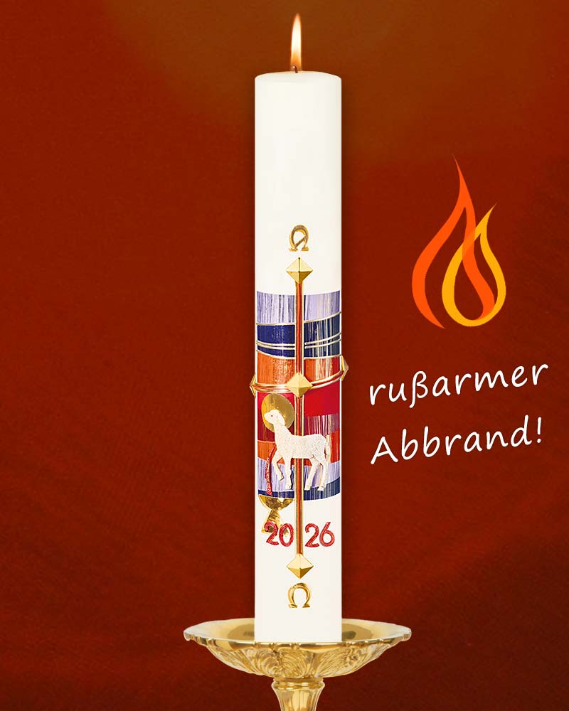 Osterkerze mit Opferlamm und Kelch, Flächendekor mit schlichtem Kreuzdekor, Jahreszahl und A + O. Inklusive Kreuznägeln aus Wachs. Hochwertige Kerzenqualtität aus deutschen Werkstätten, mit 10% Bienenwachs. Jedes Stück ein Unikat, liebevoll mit Hand verziert.