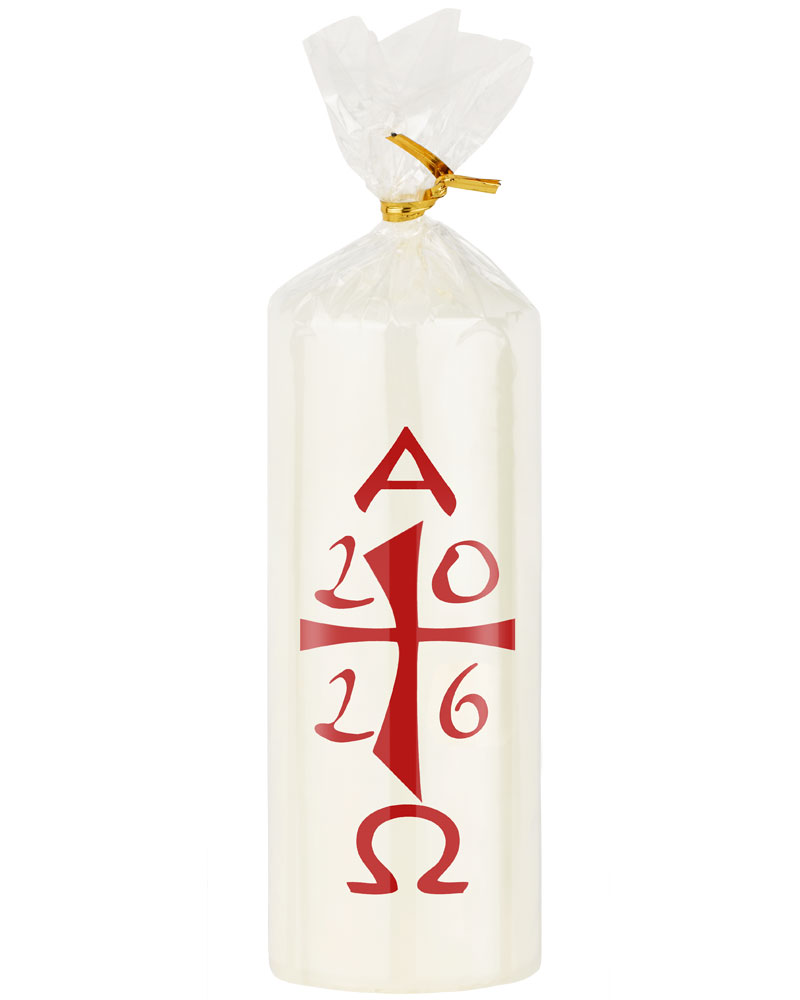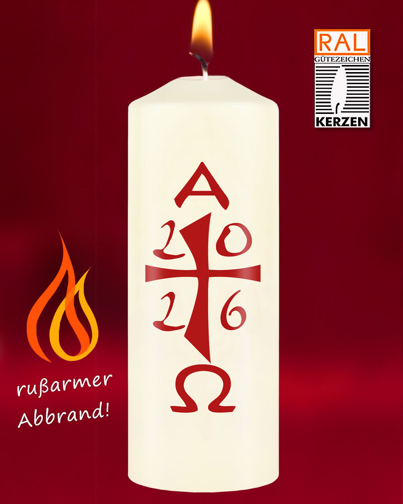 Osterkerze 150 x 60 mm, Kreuz in Rot, A + O und Jahreszahl passend als Tischkerze. Einzelverpackung in Cellophan.