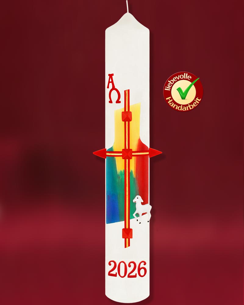 Nach traditionellen Techniken, werden die Wachsapplikationen, in harmonischer Farbgestaltung, liebevoll von Hand auf die Osterkerzen appliziert. Passend zur österlichen Liturgie wurde ein Kreuzsymbol und die Buchstaben Alpha und Omega mit goldenen Kontouren wertvoll hervorgehoben. Das Lamm Gottes ist als Wachsrelief plastisch ausgeführt. Es steht als Symbol für Jesus Christus der für uns am Kreuz gestorben ist. Die Tischkerze aus deutscher Fertigung hat eine elfenbeinfarbige, seidig glänzende Oberfläche. Das RAL Gütesiegel bürgt für den rußarmen und tropffreien Abbrand der Kerze.
