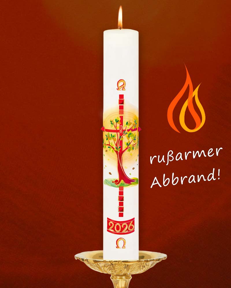 Osterkerze „Lebensbaum mit Sonne“. Ein Verbund aus Baum und Kreuz, Jahreszahl und A + O, inklusiver der Nägel. Wachsapplikationen haben harmonische Farbverläufe und ein zeitgemäßes Design. Hochwertige Kerzenqualtität aus deutschen Werkstätten, mit 10% Bienenwachs. Jedes Stück ein Unikat, liebevoll mit Hand verziert.