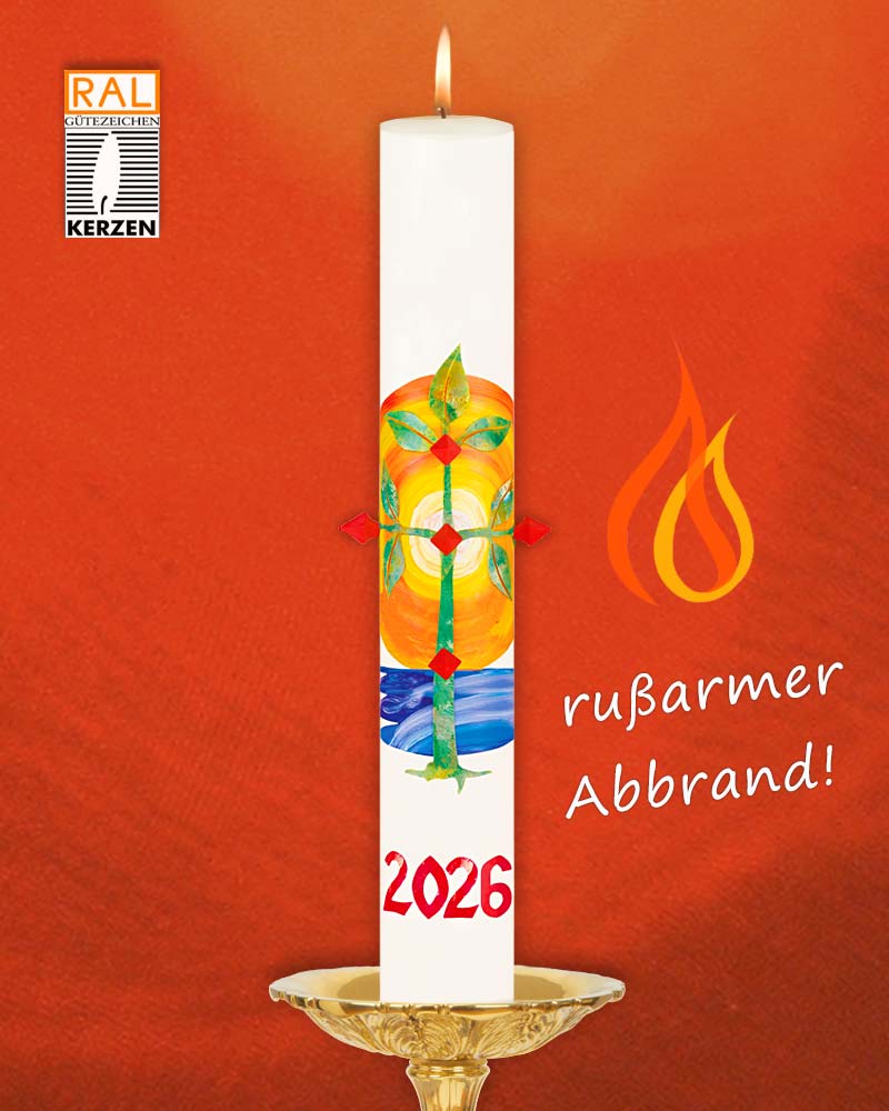 Osterkerze 600 x 80 mm „Lebensbaum“ mit aufgehender Ostersonne, Jahreszahl, A + O und einsteckbare Wachsnägel. Eine liebevolle Handarbeit in Klostermanier, aus deutschem Atelier. Farbenfrohe Wachsapplikationen von rot bis gelb und grün bis blau. Detailreich und liebevoll gestaltet, in beeindruckend schöner Ausführung.