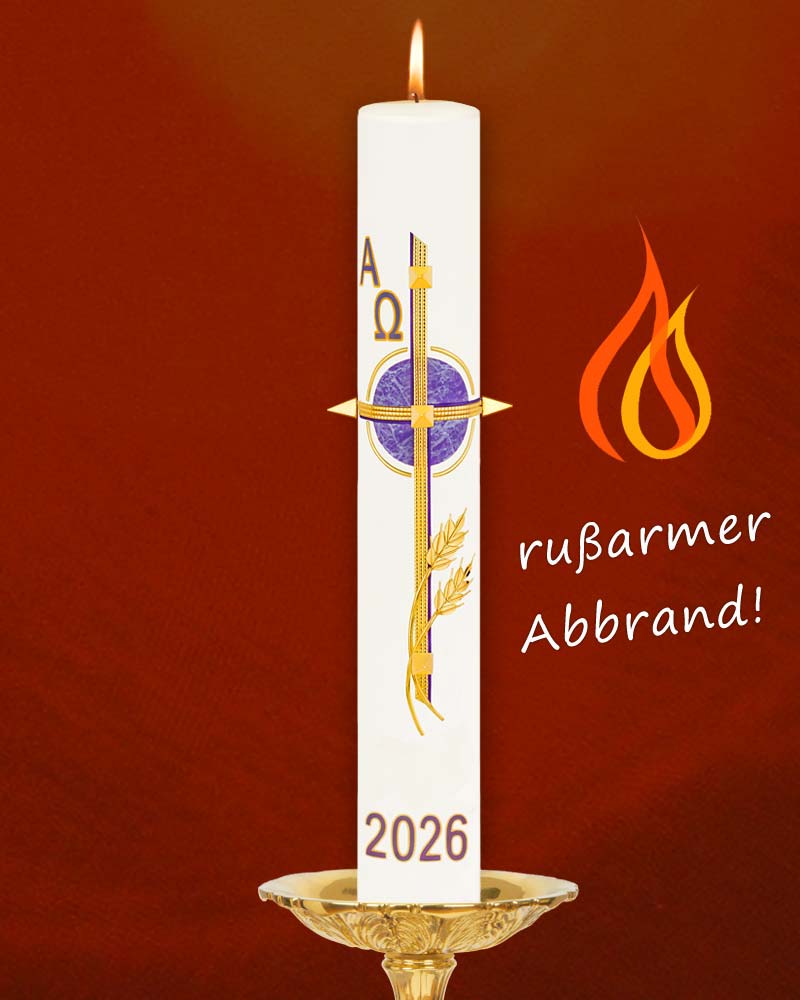 Osterkerze 600 x 80mm, Kreuz mit Ähren schlicht, violett / gold, A + O, mit Nägeln und Jahreszahl.
