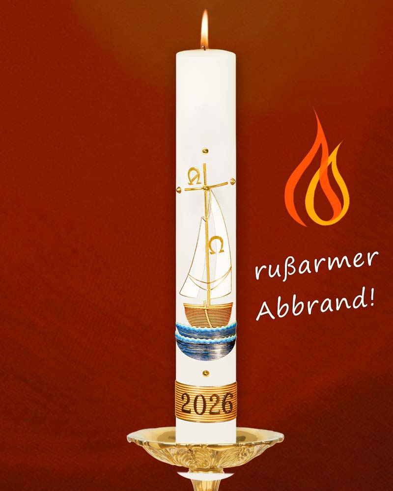 Liebevoll von Hand verzierte Osterkerze 600 x 80 mm in hochwertiger Kirchenkerzenqualität mit 10% Bienenwachs. Die Osterkerze ziert ein Schiff mit einem Kreuz als Mast. Das Schiff steht für die Gemeinschaft der Kirche auf der Reise zu Gott.