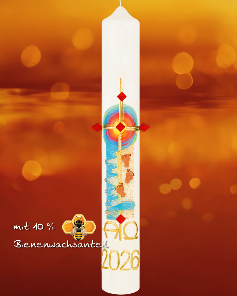 Liebevoll von Hand verzierte Osterkerze 600 x 80 mm in hochwertiger Kirchenkerzenqualität mit 10% Bienenwachs. Kreuz mit einsteckbaren Nägeln, A+O und Jahreszahl. Die Kerze ziert die Darstellung Spuren im Sand.