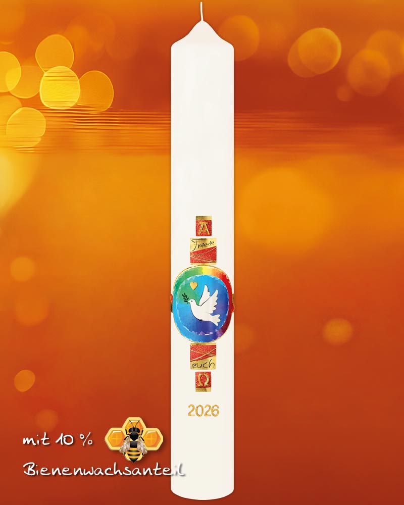 Liebevoll von Hand verzierte Osterkerze 600 x 80 mm in hochwertiger Kirchenkerzenqualität mit 10% Bienenwachs. Die Kerze ziert eine schöngestaltete weiße Taube mit wellenförmigen Flügeln und einem Olivenzweig im Schnabel auf einem regenbogenfarbigem Kreissymbol mit kleinem goldenem Herz. Gerahmt von den goldroten Textblöcken A/O und Friede sei mit Euch und der Jahreszahl.