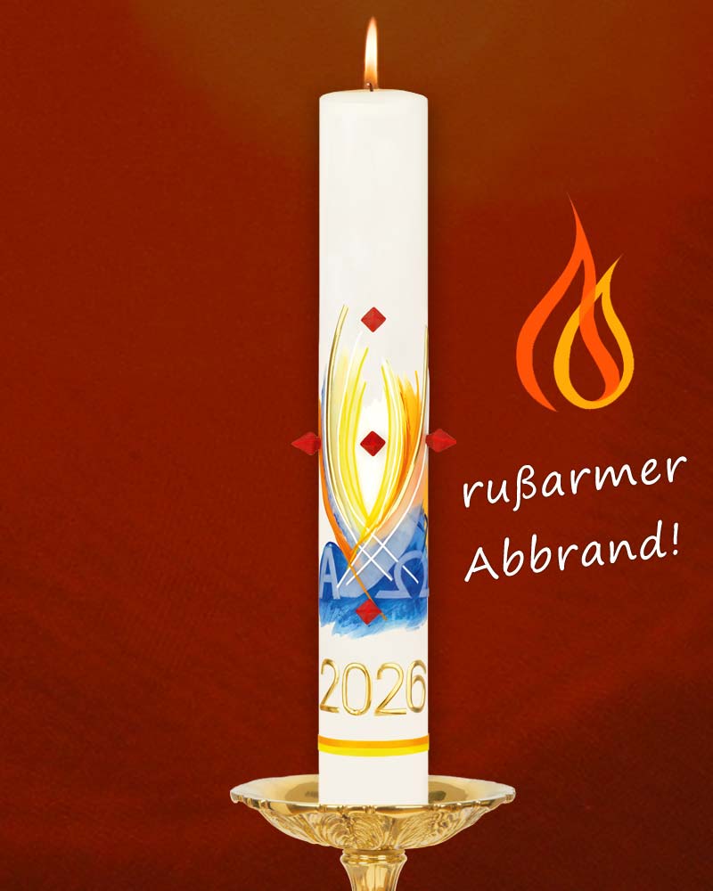 Diese Osterkerze im Format 800 x 80 mm ist aus hochwertigem Wachs gefertigt und für die liturgischen Feiern der Osternacht sowie der Osterzeit konzipiert. Im Zentrum steht das farbenfrohe Motiv „Ich mache alles neu“, passend zur Jahreslosung. Die Gestaltung in Orange, Gelb, Rot und Blau vermittelt Hoffnung und Erneuerung. Ergänzt wird die Kerze durch die traditionellen Zeichen Alpha und Omega, die aktuelle Jahreszahl sowie fünf Nägel, die symbolisch für die Wundmale Christi stehen.