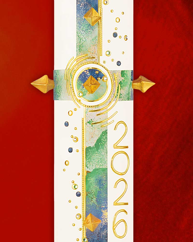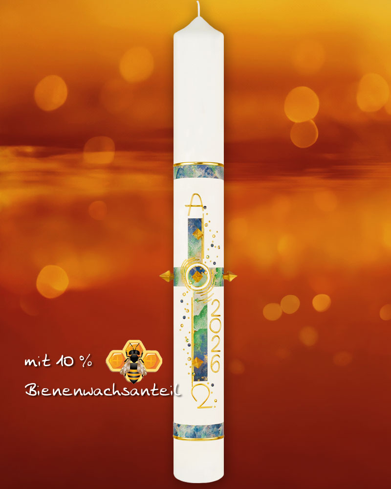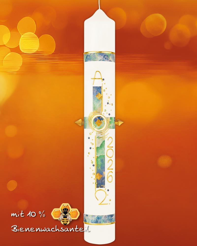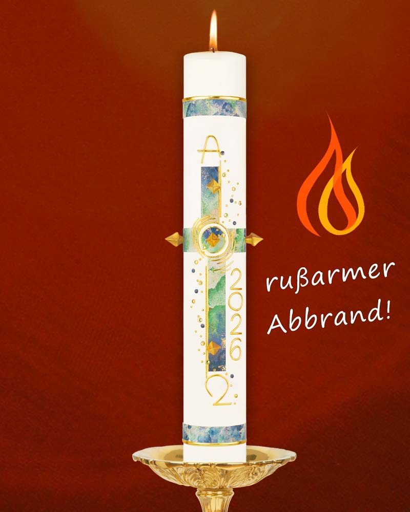 Die Osterkerze „Creatio“ im Format 800 x 80 mm wird in bewährter Altarkerzenqualität gefertigt und ist speziell für die liturgische Feier der Osternacht und Osterzeit konzipiert. Das blau-grün marmorierte Schöpfungsmotiv steht für Hoffnung und Neuanfang. Ergänzt wird das Design durch Alpha und Omega, eine goldene Jahreszahl, fünf goldene Nägel sowie Ziersteine, die symbolisch und optisch Akzente setzen. Die Kerze besteht aus Paraffin mit 10 % Bienenwachs, ist tropffrei und verfügt über ein Dornloch. Sie wiegt ca. 3470 g, brennt durchschnittlich 483 Stunden und trägt das RAL-Gütesiegel.