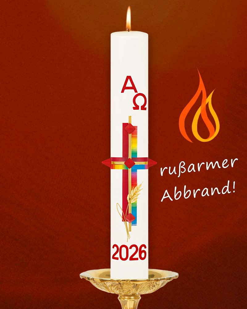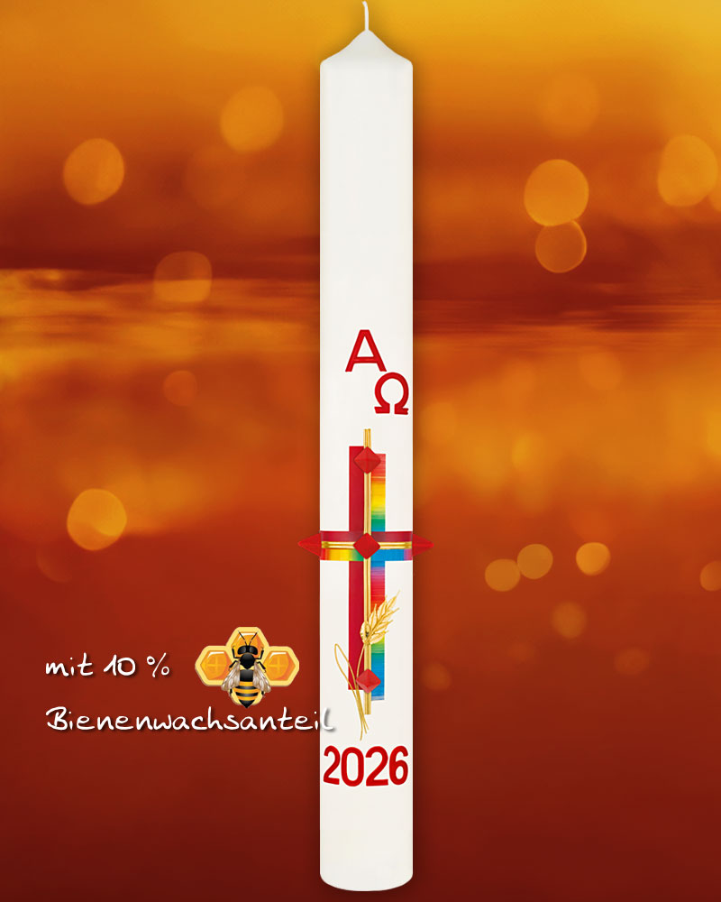 Osterkerze im Format 600 x 80 mm mit klassischem Kreuzmotiv in Regenbogenfarben, ergänzt durch goldfarbene Ähren, rote Nägel zum Einstecken und die Symbole Alpha und Omega. Die Jahreszahl 2026 ist gut sichtbar aufgebracht. Der Wachsanteil beträgt mindestens 10 % Bienenwachs und sorgt für eine ruhige, gleichmäßige Brenndauer. Die Gestaltung der Kerze nimmt Bezug auf die Auferstehung Christi, die fünf Wundmale und die Eucharistie als Brot des Lebens. Sie eignet sich für die Osternacht, den Altarraum und die gesamte Osterzeit.