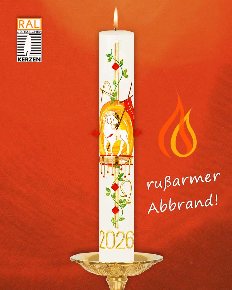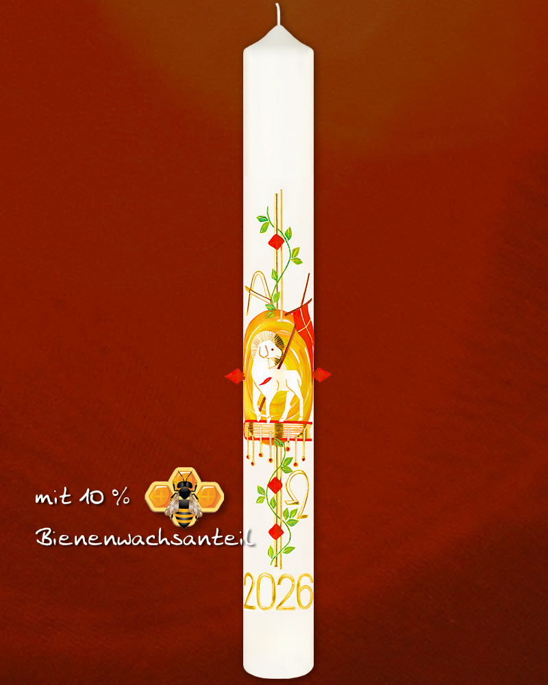 Osterkerze mit einem Lamm, Fahne vor einer aufgehenden Ostersonne in goldenem Farbverlauf. Kreuzinterpretation im Hintergrund, Jahreszahlen und A + O gold appliziert, inkl. Kreuznägel. Diese Osterkerze ist eine hochwertige Arbeit aus deutscher Wachszieherei. Detailreich und liebevoll gestaltet, in beeindruckend schöner Ausführung.