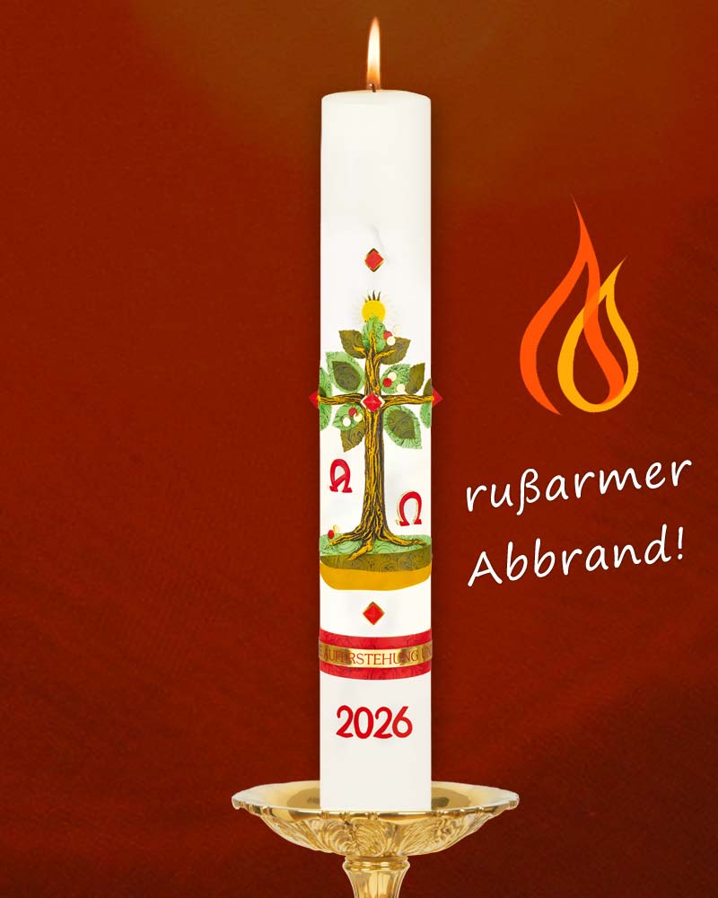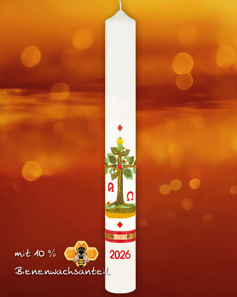 Osterkerze 800 x 80 mm, liebvoll und detailreich ausgearbeiteter Lebensbaum in Kreuzform, mit Sonne, Jahreszahl und Nägeln, A + O. Goldenes Schriftband "Ich bin die Auferstehung"
