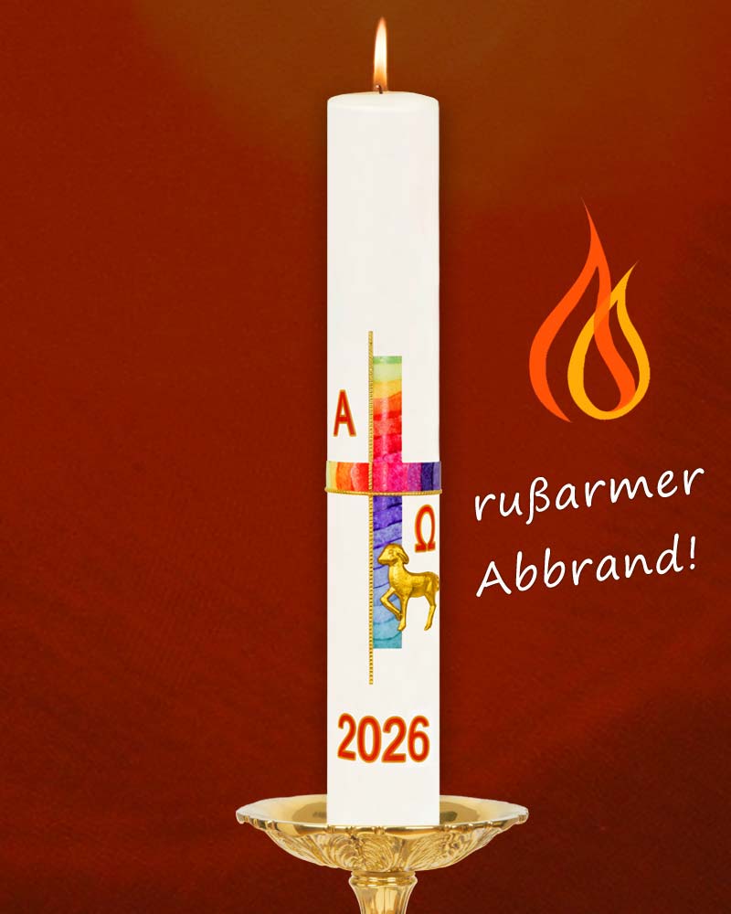 Kerze Osterlamm mit Kreuzdekor in zeitgemäßem Design, Altarkerzenqualität mit 10 % Bienenwachs, 800 x 80 mm. Das Lamm Gottes, dass Kreuz und die Jahreszahl, wurden in liebevoller Handarbeit, aufwendig aus Wachs appliziert. Die Buchstaben A + O stehen als Symbol für Jesus Christus, vom Anbeginn bis zum Ende.