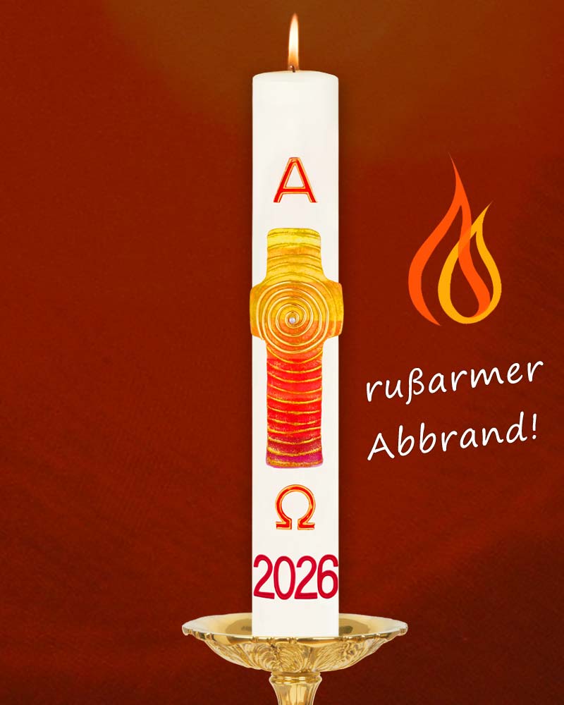 Diese Osterkerze ist in zeitgemäßer schöner Ausführung, gefertigt und verziert in deutschen Wachsziehereien. Ceresin mit 10% Bienenwachs für rußarmen Abbrand.