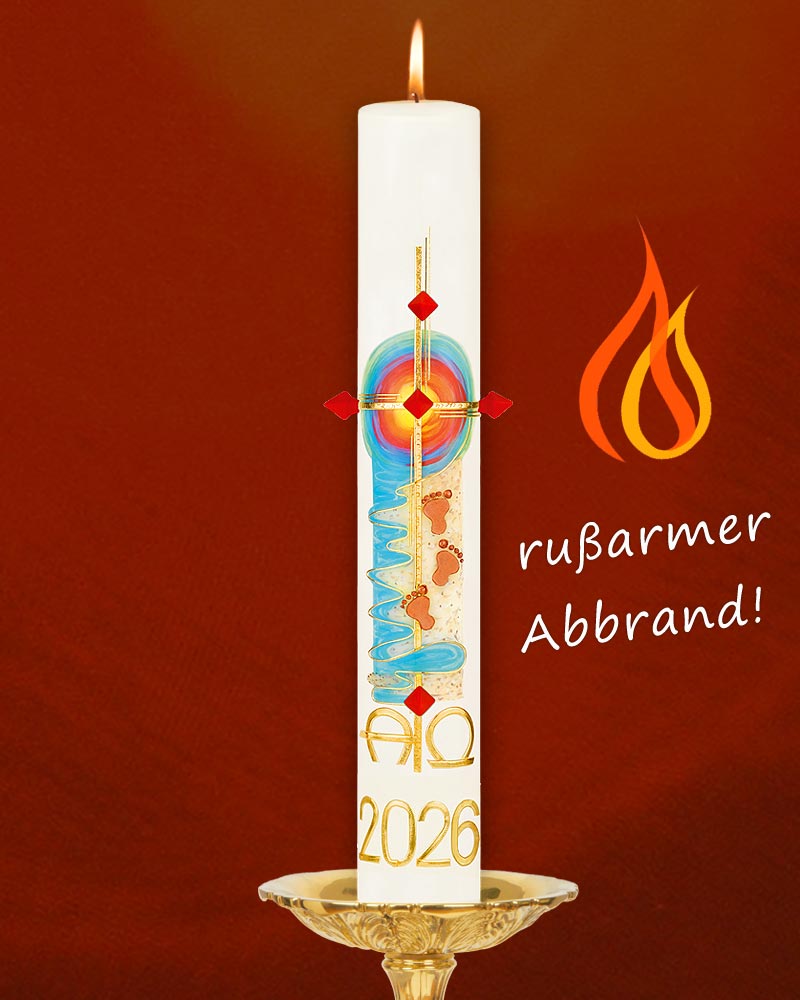 Liebevoll von Hand verzierte Osterkerze 800 x 80 mm in hochwertiger Kirchenkerzenqualität mit 10% Bienenwachs. Kreuz mit einsteckbaren Nägeln, A+O und Jahreszahl. Die Kerze ziert die Darstellung Spuren im Sand.