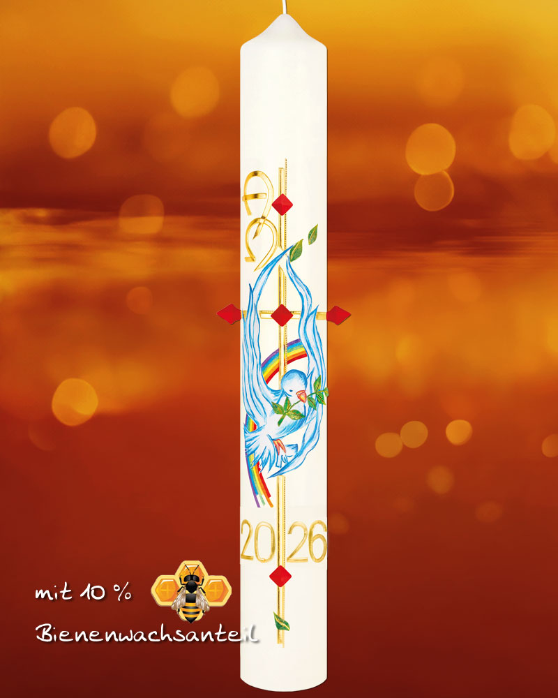 Liebevoll von Hand verzierte Osterkerze 600 x 80 mm in hochwertiger Kirchenkerzenqualität mit 10% Bienenwachs. Goldenes Kreuz mit vorgebohrten Löchern zum Einstecken von roten Wachsnägeln (in der Lieferung inklusive). Die Kerze ziert eine eindrucksvoll gestaltete Taube mit wellenförmigen Flügeln, sie trägt einen Olivenzweig im Schnabel "Die frohe Botschaft". Im Hintergrund umrahmt ein Regenbogen.