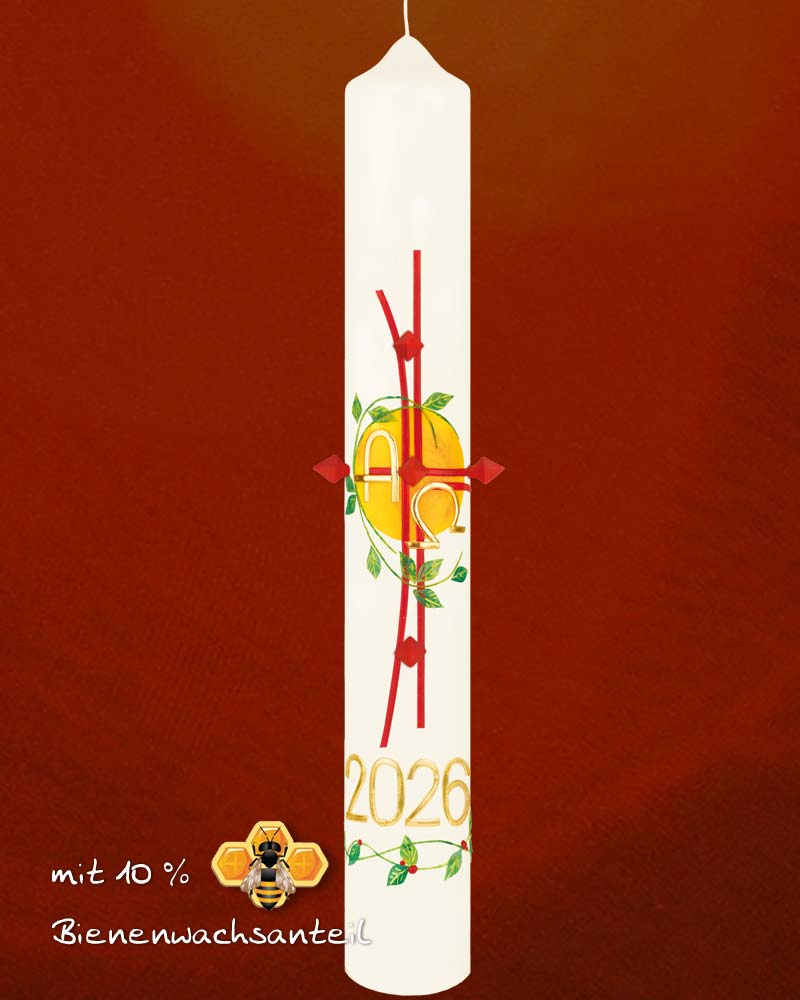 Osterkerze 600 x 80 mm „Rankenkreuz“, rotes, modernes Kreuz mit Blätterranken vor aufgehender Ostersonne. Aktuelle Jahreszahl, A + O und einsteckbare Wachsnägel. Eine liebevolle Handarbeitskerze in Klostermanier, aus deutschem Atelier. Farbenfrohe Wachsapplikationen, in zeitgemäßem Design.