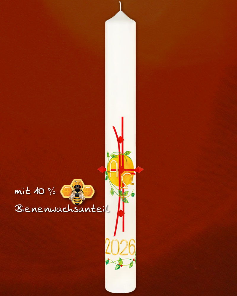 Osterkerze 800 x 80 mm „Rankenkreuz“, rotes, modernes Kreuz mit Blätterranken vor aufgehender Ostersonne. Aktuelle Jahreszahl, A + O und einsteckbare Wachsnägel. Eine liebevolle Handarbeitskerze in Klostermanier, aus deutschem Atelier. Farbenfrohe Wachsapplikationen, in zeitgemäßem Design.