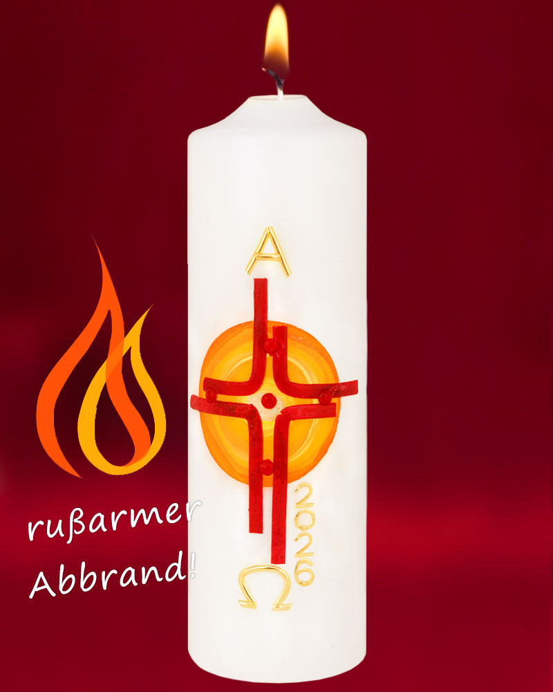 Tischkerze „Ostersonne“, 225 x 70 mm, A +O mit Kreuzsymbol und Jahreszahl, aus farbigen Wachsapplikationen, Handarbeit.
