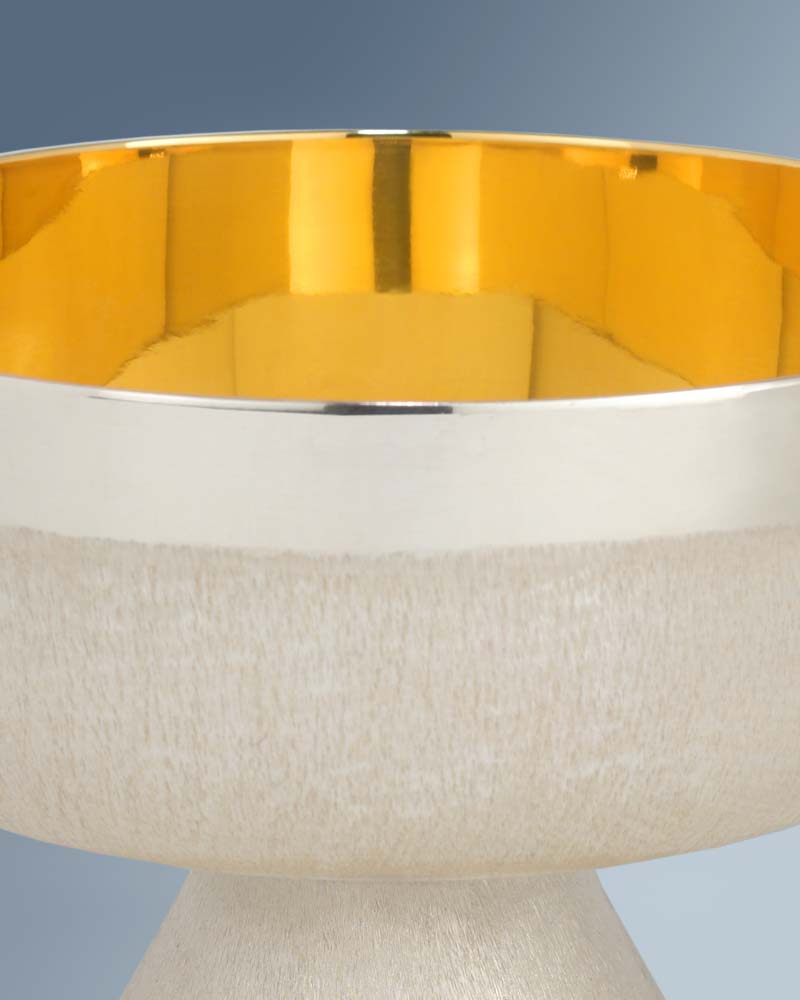 Hostienschale in hoher Form, 9 cm hoch, versilbert und innen vergoldet. Die fein strukturierte Oberfläche schützt gegen Fingerabdrücke, 14 cm Ø für ca. 300 Brothostien.