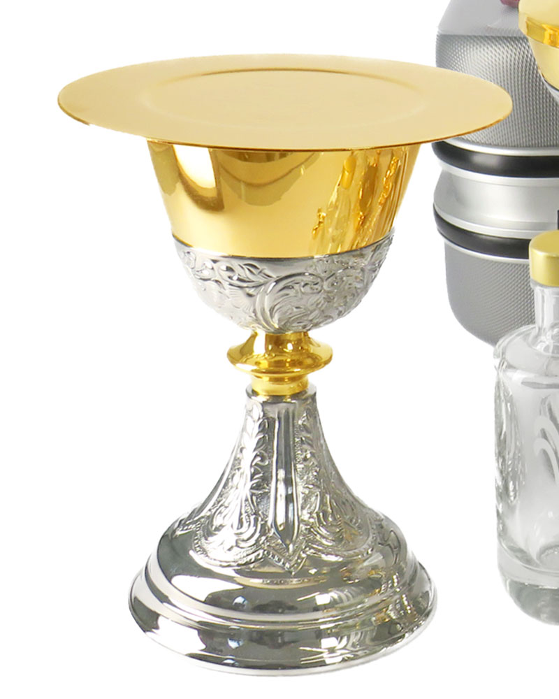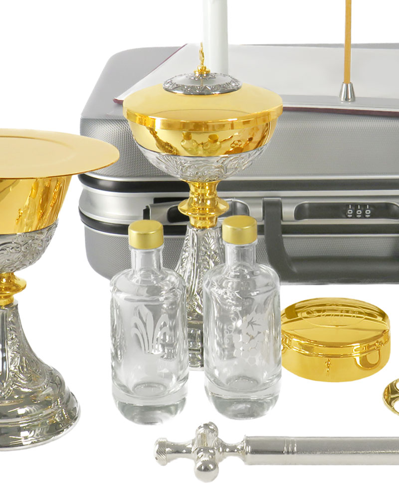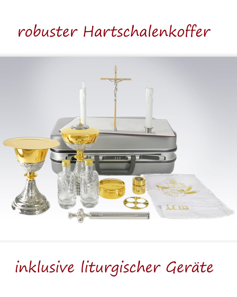 Der Messkoffer enthält eine vollständige Ausstattung für die Feier der Krankenkommunion und die Spendung der Sakramente unterwegs. Im Set enthalten sind ein Kelch (Ø 8,5 cm, Höhe 21 cm), ein Ziborium (Ø 9 cm, Höhe 14,5 cm), eine Hostiendose, eine Hostienschale, ein Kreuz mit Christuskorpus (10 x 22 cm), Weihwasserflaschen, ein Aspergill, eine Versehstola, Ölgefäße, Kelchwäsche sowie eine Versehpatene mit IHS Gravur (Ø 15,5 cm). Der Koffer ermöglicht eine geordnete und sichere Aufbewahrung aller liturgischen Geräte und eignet sich für den mobilen Einsatz in Gemeinde, Krankenhaus und Seelsorge. Die kompakte Zusammenstellung unterstützt eine praktische Handhabung bei Hausbesuchen und in der sakramentalen Versorgung.