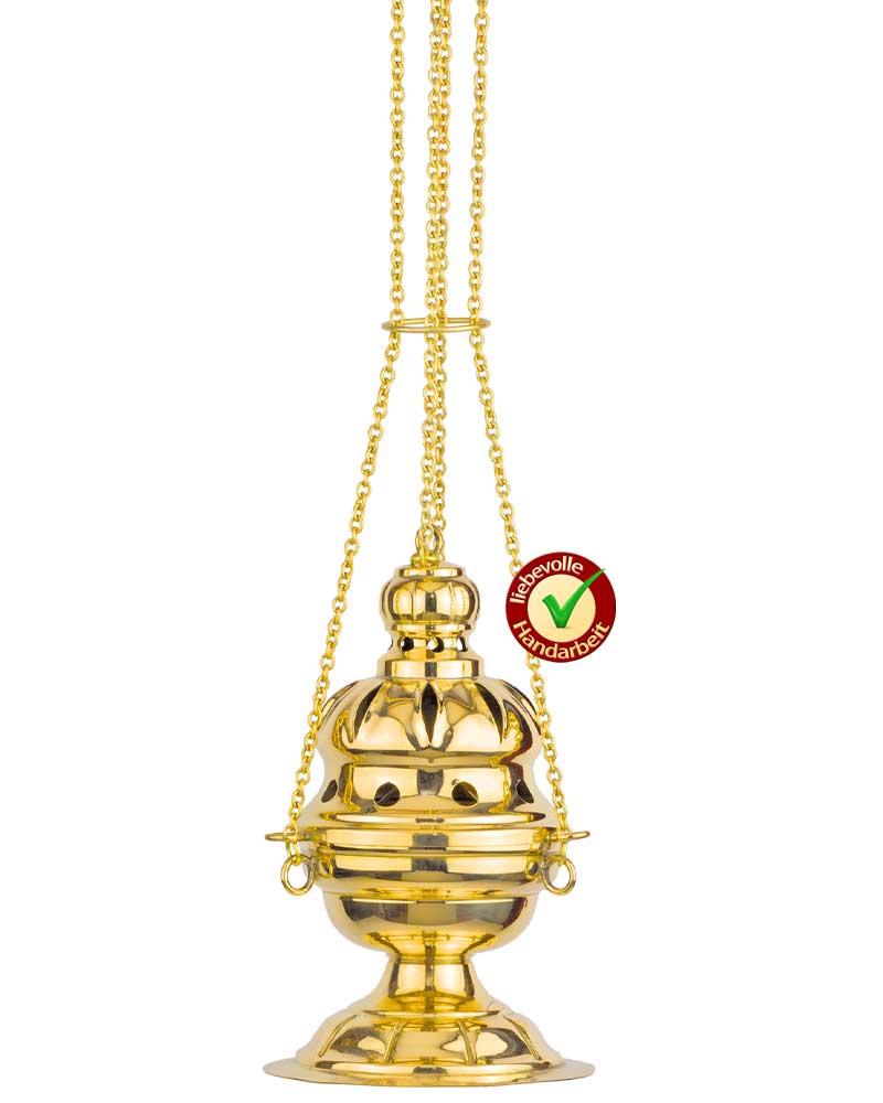 Dieser Weihrauchschwenker aus poliertem Messing ist in barocker Form gefertigt und eignet sich für den liturgischen Einsatz in Messe und Andacht. Mit einem runden Standfuß von 13 cm Durchmesser und einer Höhe von 22 cm bietet er sicheren Halt und eine ausgewogene Form. Die Kette misst 68 cm, inklusive Ordnungshalter, was eine stabile Handhabung gewährleistet. Das enthaltene Kohlepfännchen mit Griff ermöglicht ein sicheres Einlegen der glühenden Kohle. Die Gesamtlänge beträgt 94 cm. Ergänzt wird das Set durch ein passendes Weihrauchschiffchen mit Klappdeckel, 9 cm hoch, mit rundem Fuß (12 cm Ø), ideal zur Aufbewahrung und Entnahme des Weihrauchs während der Liturgie.