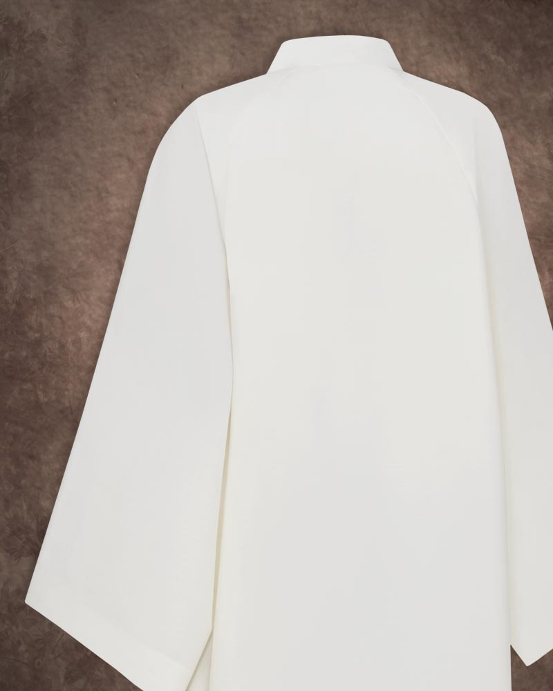 Albe im Raglanschnitt, aus strapazierfähigem, cremefarbigen Paramentenstoff in 55 % Trevira (Polyester) und 45 % Wolle. Pflegeleicht beim Waschen und Bügeln. Durch die Verarbeitung mit Stehkragen, schließt die Albe oben am Hals gut ab. Hochwertige Konfektion, geeignet für Frauen und Männer.