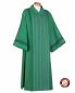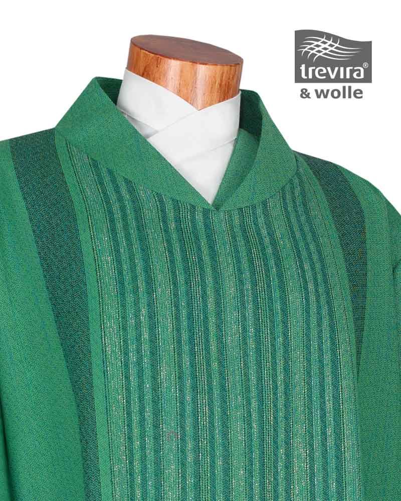 Dalmatik mit asymmetrisch eingewebtem Streifendekor, gefüttert mit Seidenponge. Der Stoff aus 25% Trevira/75% Wolle (1,3 kg) ist knitterarm und strapazierfähig und bietet einen hohen Tragekomfort. Konfektion mit V-Ausschnitt und Stehkragen, seitlich geschlitzt, 130 cm lang, inklusive schmaler Diakonstola.