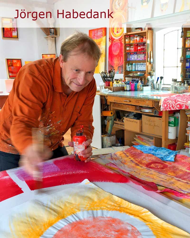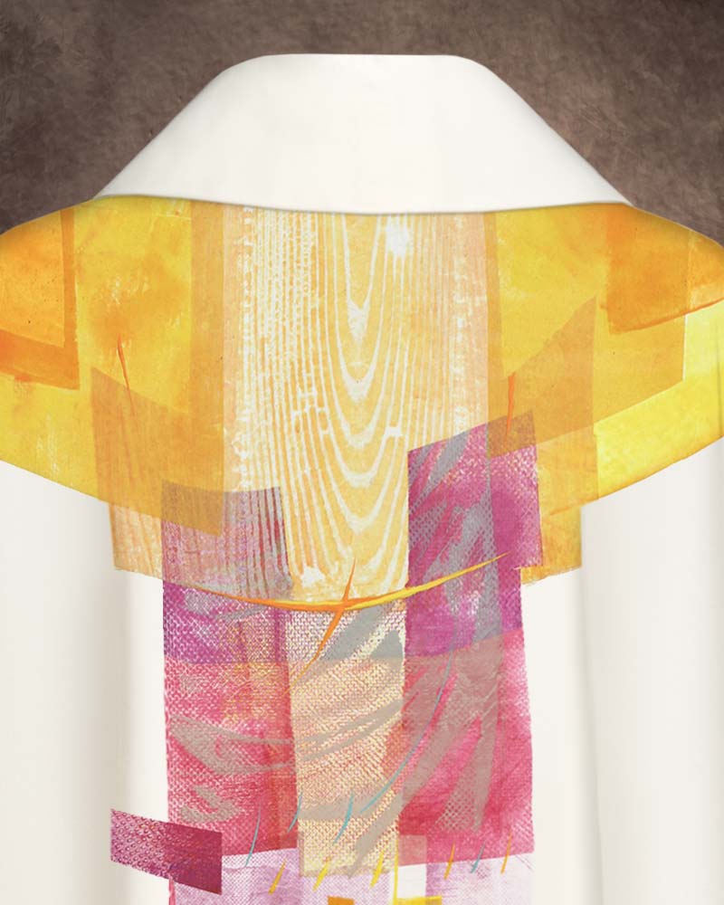 Die Darstellung „Christ König“ verweist auf das Hochfest am Ende des Kirchenjahres, das die Herrschaft Christi über die Welt betont. Die Kasel transportiert diese theologische Aussage durch das abstrahierte, farbintensive Motiv des Künstlers Jörgen Habedank, der sich in seiner Arbeit oft mit sakralen Themen auseinandersetzt. Seine moderne Formensprache und die symbolhafte Farbgestaltung schlagen eine Brücke zwischen zeitgenössischer Kunst und liturgischer Tradition. Die Kasel wird so nicht nur zur liturgischen Kleidung, sondern auch zum Ausdruck einer lebendigen Glaubenspraxis, die das Transzendente in die Gegenwart holt – in Form, Farbe und Funktion.