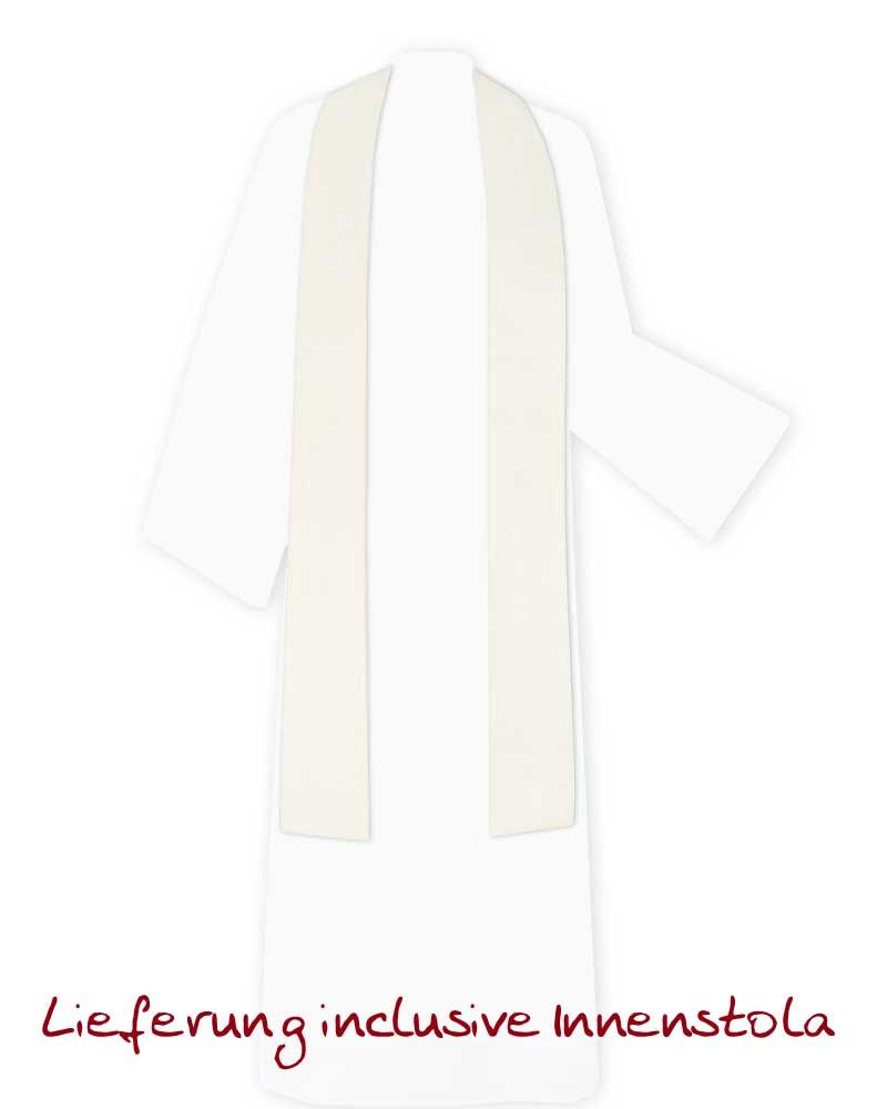 Die weiße Kasel „Christ König“ mit Rundkragen ist eine hochwertige liturgische Gewandung für Hochfeste und feierliche Gottesdienste. Sie misst 135 cm in der Länge und wird inklusive farblich passender Innenstola geliefert. Gefertigt aus einem modernen Mischgewebe (74 % Polyester, 24 % Wolle, 2 % Elastan), bietet sie angenehmen Tragekomfort und gute Formstabilität. Das Design stammt von Jörgen Habedank und zeigt eine stilisierte Darstellung des Christus-König-Motivs. Die Kasel eignet sich für Priester und liturgische Dienste, die ein ausdrucksstarkes, zugleich funktionales Parament suchen. Pflegeleicht und liturgisch vielseitig einsetzbar, ist sie ideal für den regelmäßigen Gebrauch.