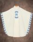 Marienkasel in weiß und blau, mit umgelegtem Rundkragen und gesticktem Marienzeichen M, sowie gestickten Ärmelabschlüssen. Der leichte Grundstoff aus 100% Polyester, ist besonders pflegeleicht. Konfektion im klassischen Rundschnitt, 135 cm lang, 154 cm breit, inklusive Innenstola.