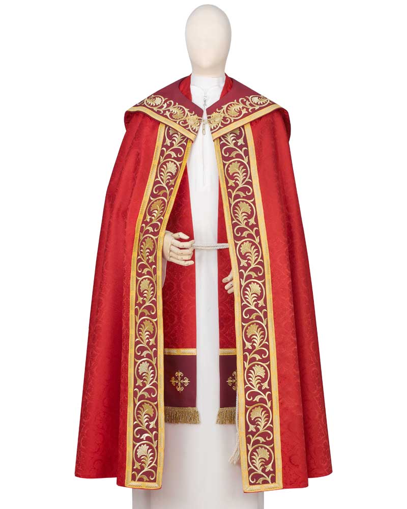 Nikolausrauchmantel, 140 cm lang, aus strapazierfähigem Damaststoff im gotischen Design, strapazierfähiges Gewebe in 100% Polyester. Hochwertige Konfektion mit Kappa und vergoldeter Rauchmantelschließe, inklusive Innenstola. Die Dekorstäbe des Nikolausgewandes sind dunkelrot abgesetzt und mit reicher Goldstickerei verziert. Die ebenfalls dunkelrot abgesetzten Cappa ist mit einem aufwändige IHS Symbolik bestickt und mit einer Franse eingefasst. Die im Lieferumfang enthaltene Stola wird unter dem Rauchmantel getragen.