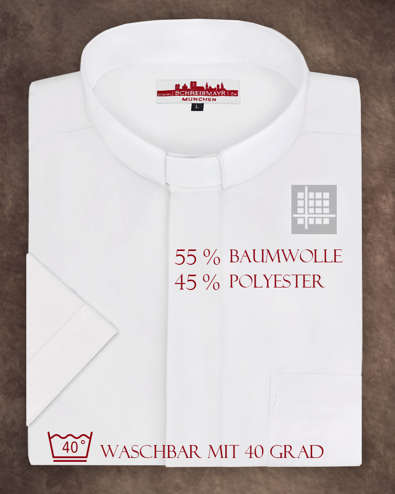 Diese Collarhemden, aus 55 % Baumwolle und 45 % Polyester, mit halbem Arm und Einsteckcollar, erhalten Sie exclusiv nur bei SCHREIBMAYR. Das Mischgewebe ist strapazierfähig, knitterarm und pflegeleicht. Durch die Verarbeitung aus leichtem Gewebe, sind die Hemden auch bei warmen Temperaturen angenehm leicht zu Tragen. Die Priesterhemden sind bequem geschnitten, mit paspelierter Brusttasche und verdeckter Knopfleiste konfektioniert. Waschbar bei 40 Grad.