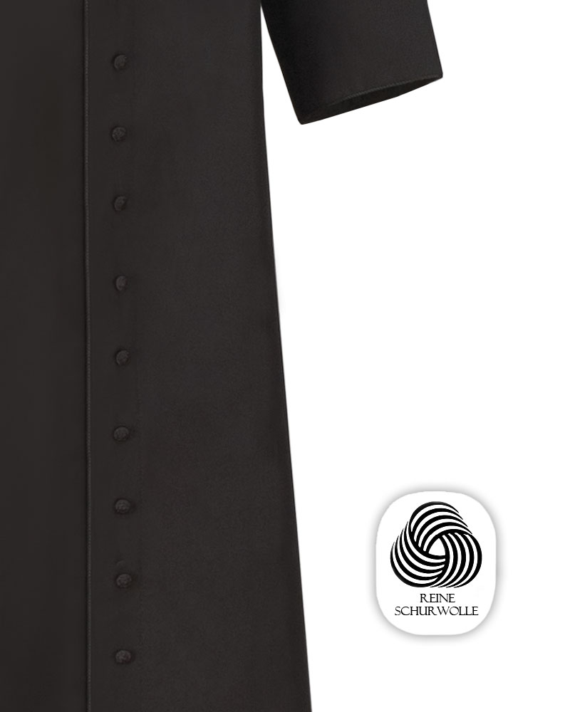Priestersoutane aus strapazierfähiger und knitterarmer 100 % Schurwolle. Die verdeckte Knopfleiste ist mit 33 stoffbespannten Knöpfen verziert. Konfektion mit Tascheneingriff, Innentasche, Saumabschluss mit Paspelierung und Biesenfranse. Klassischer, römischer Kragen. Das Zingulum ist im Preis nicht enthalten